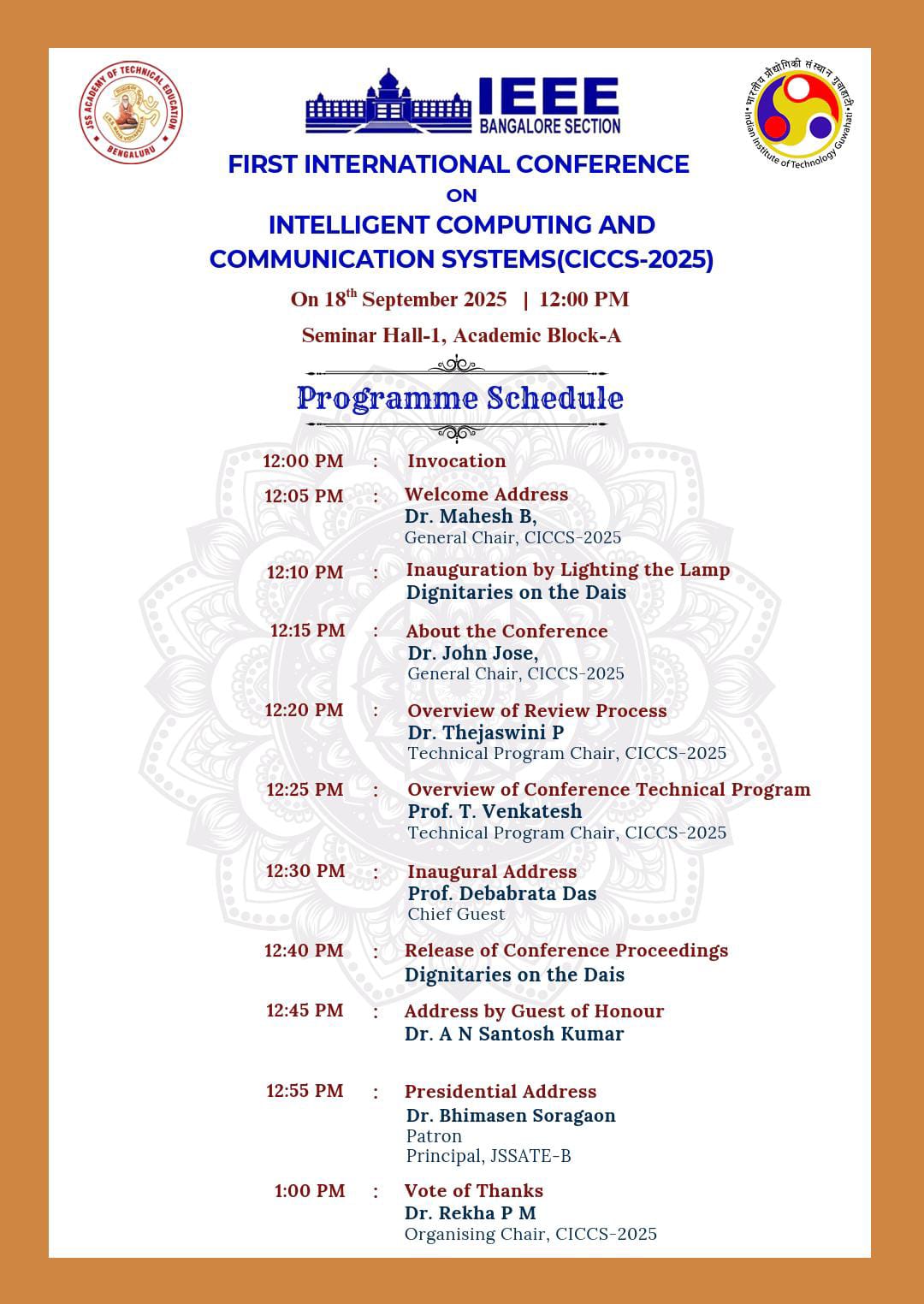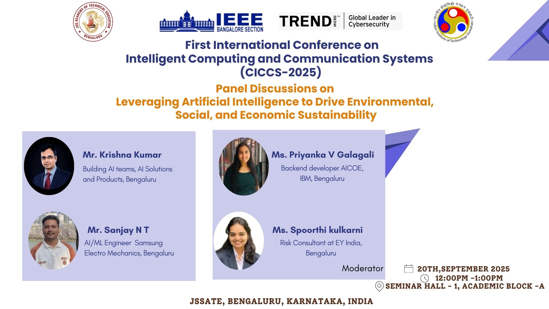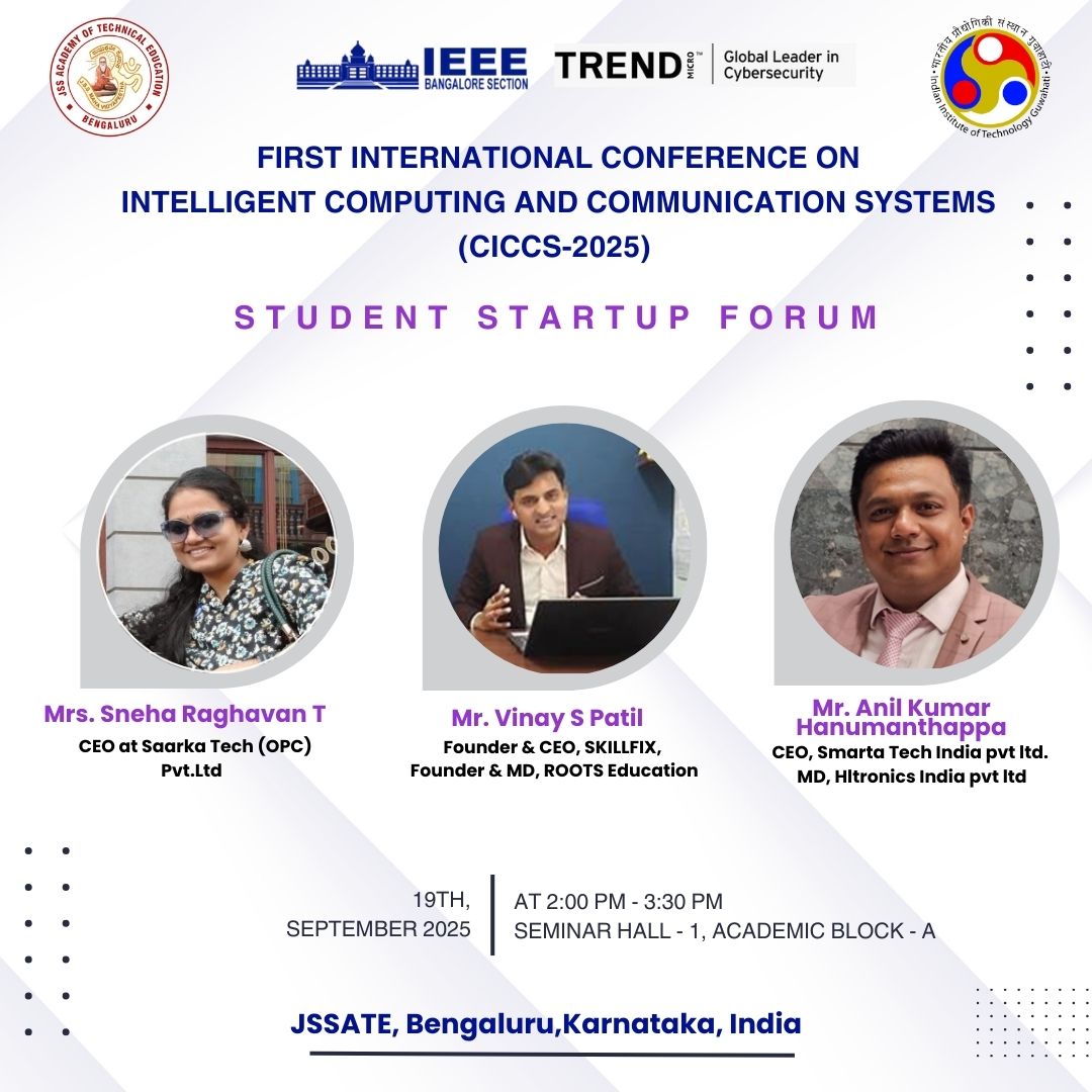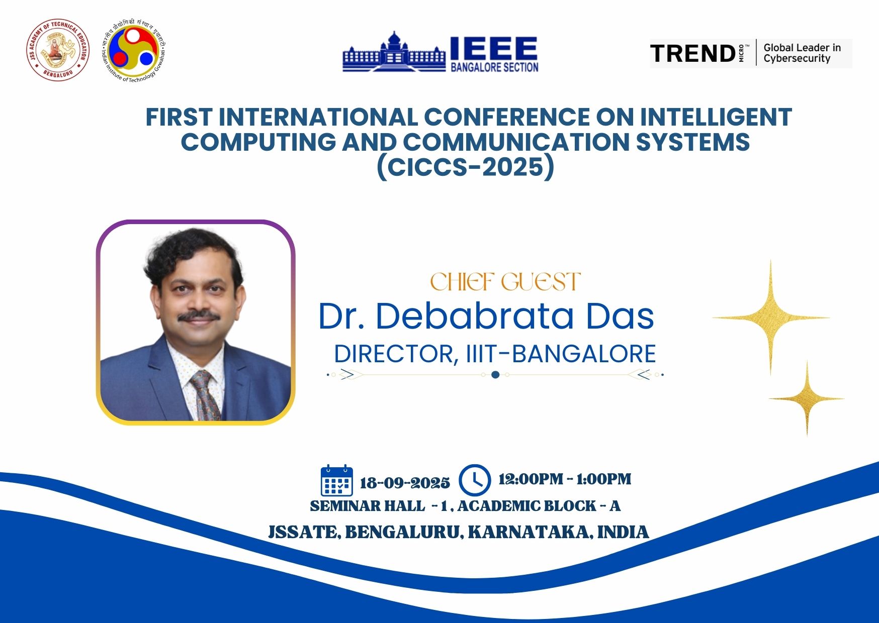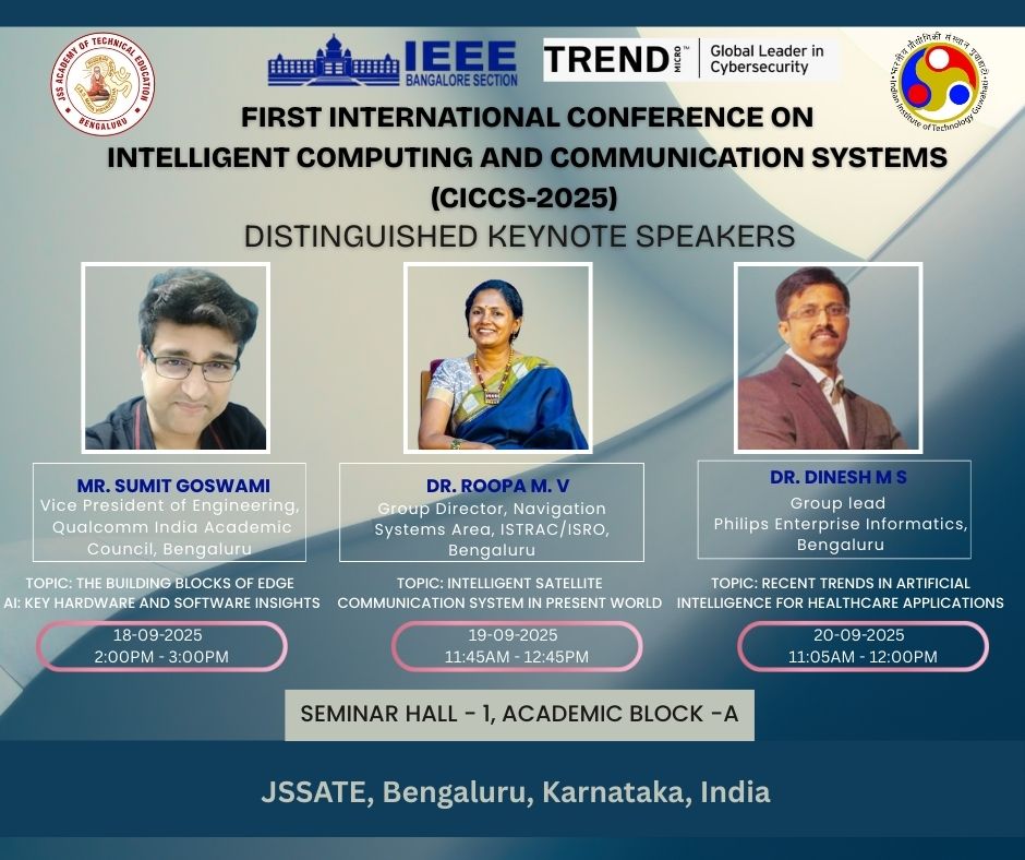 JSS Academy of Technical Education, Bengaluru, in collaboration with the Indian Institute of Technology Guwahati, is organizing the International Conference on Intelligent Computing and Communication Systems (CICCS-2025), with technical co-sponsorship from the IEEE Bangalore Section. This conference serves as a platform for researchers, students, practitioners from academia & industry to explore advancements and exchange insights in the field of Intelligent Computing and Communication Systems. Centered around the theme Leveraging AI for Sustainable Computing and Communication.